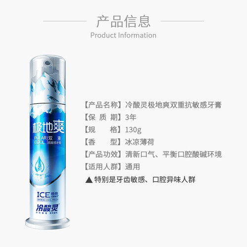 特含双重抗敏感因子,帮助缓解牙齿敏感;精心调制极地冰爽薄荷,刷牙瞬间激发酷爽体验;直立泵式设计,个性十足。