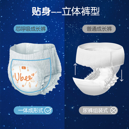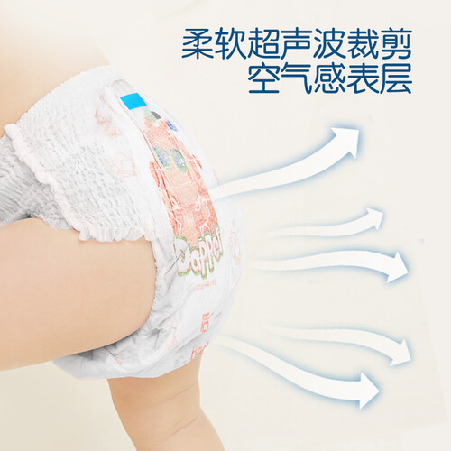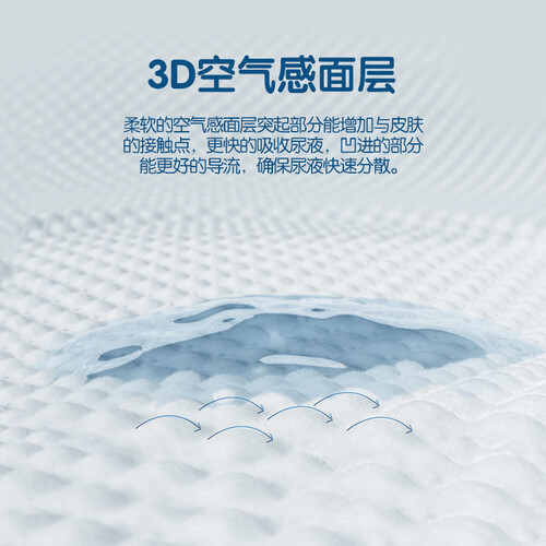 3D空气感面层的设计,有效加速尿液的扩散,快速干爽,持久舒爽。悬浮芯翼,能够快速排出闷热湿气,让宝宝的肌肤自由呼吸。