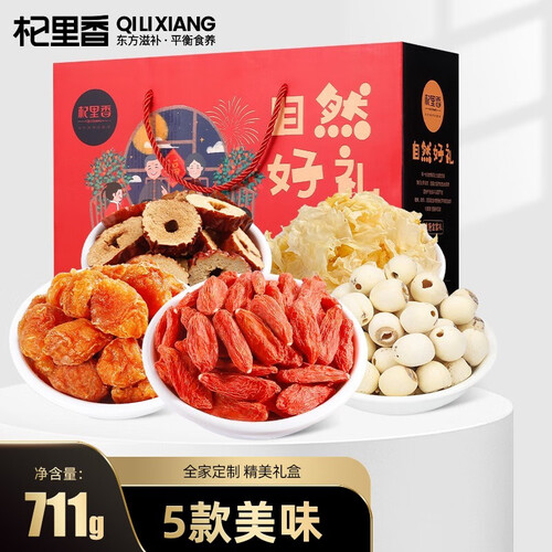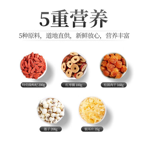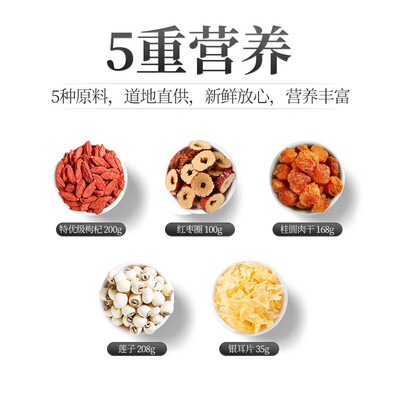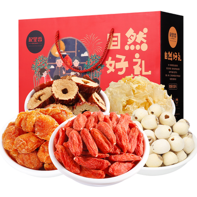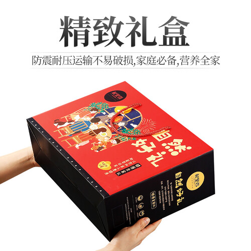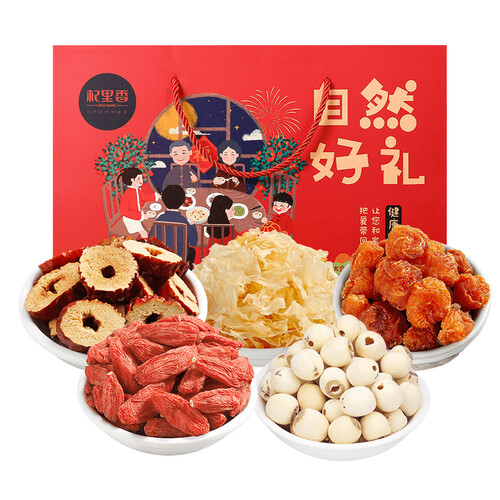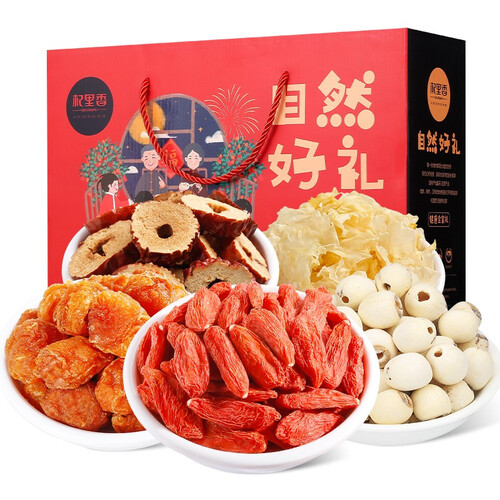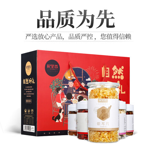 内含5种不同种类的干货,颗粒饱满,营养丰富,是老少皆宜的美食。精美的礼盒装搭配手绘插画,富有质感,送礼更体面。