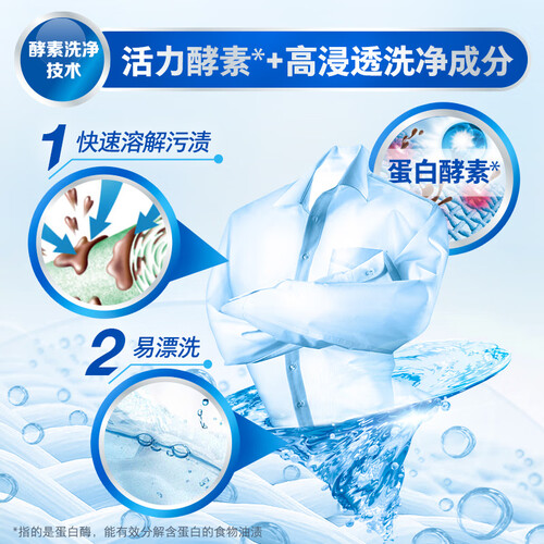 洗衣液含有蛋白酵素,衣物纤维也能进入,轻松剥落顽固污渍。采用温和洁净配方,清洗衣物后可有效防止细菌滋生。