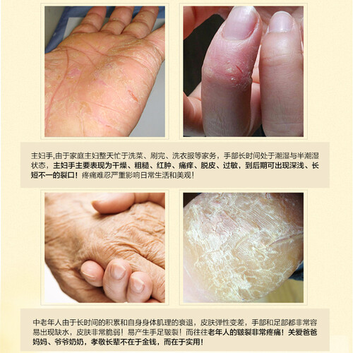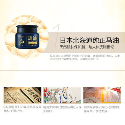 有效改善出血、手脚开裂等现象,添加北海道的马油成分,更接近肌肤的皮质结构,能够形成天然的保护屏障,渗透力更强。