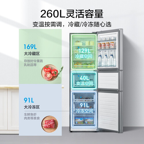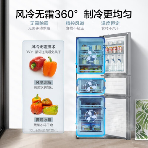 环抱式送风技术,冷风不直吹食材,呵护食材不易被风干。搭载出色的能效设计,节能降耗更省电,家用更舒心。
