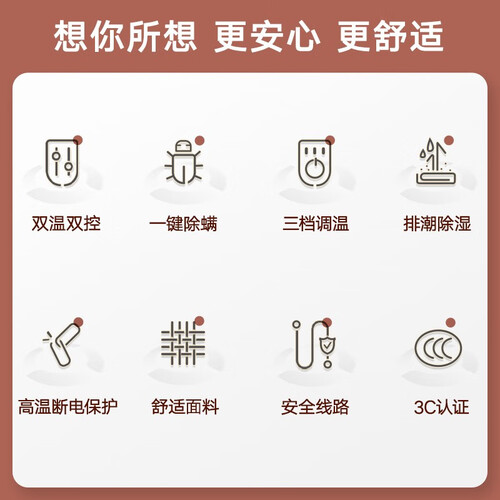 智能降档 | 人在睡眠的状态下,低温会慢慢下降,通过人性化的开关设计,使电热毯加热半个小时后,自动降至舒适档位,保暖不上火;双螺旋发热技术,过热保护,自动断电。