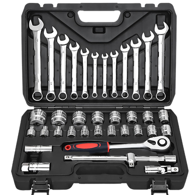 两用扳手采用铬钒钢材质,精工锻造,不会生锈,使用寿命长久。S2合金钢压批套筒,硬度高达58-60HRC,结实耐用。