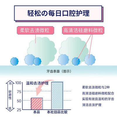 内含高清洁柜磨料分子,能够亮白牙齿。搭配高清洁硅磨料摩擦牙齿,能够去除牙结石。日本原装进口,品质更有保障。