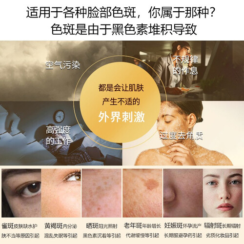 含有专利祛斑因子,减少面部色斑,增加肌肤的通透性。同时添加维生素C,可有效抑制黑色素的产生,肌肤白皙有光泽。
