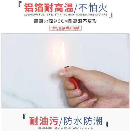 采用铝箔材质,耐高温不易变形,与火源保持安全距离即可;贴膜防水防油,适合粘贴于厨房,轻轻擦拭告别油污,保持干净整洁。