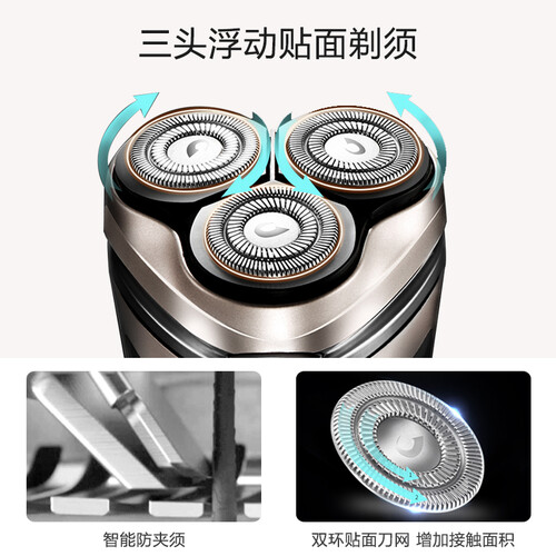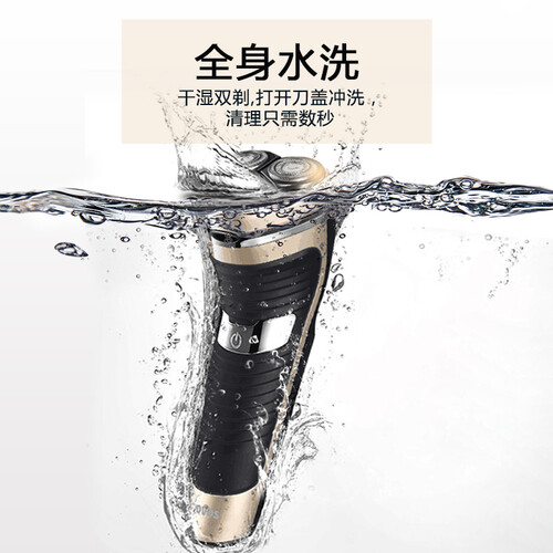 全身可水洗的剃须刀,防水耐用,延长使用寿命。结合浮动三刀头,贴合面部轮廓,剃须舒适,打造精致面容。