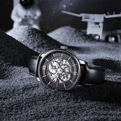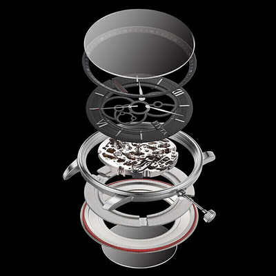 腕表盘面多层次的提炼枪色元素,带有金属光泽演绎个性摩登的时尚风格。透底镂空的复刻底盖,抽象表达镜头形态凸显摄影情怀。