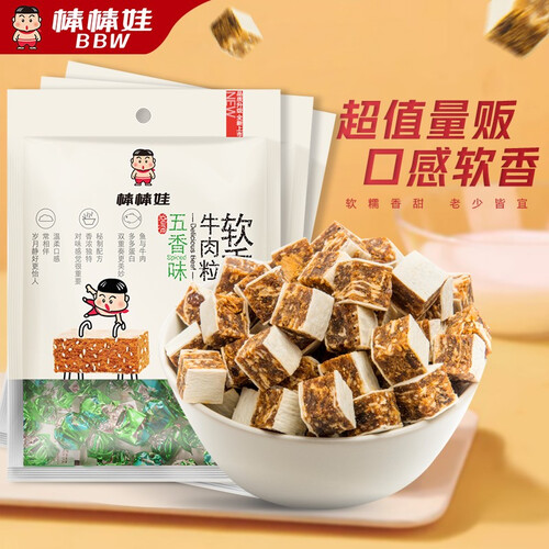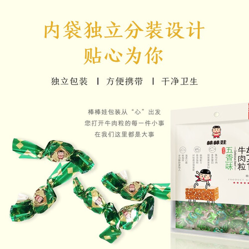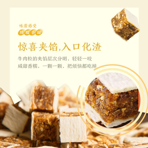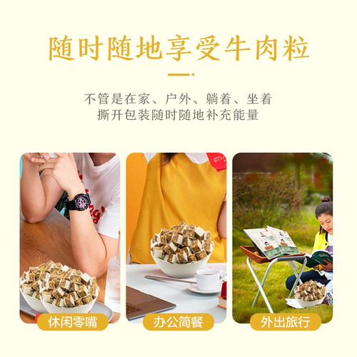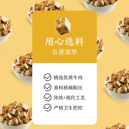 精心挑选的牛肉,韧性好,品尝一口,嚼劲十足。经人工切割而成的小颗粒,均匀饱满,口感更佳,适合旅途中解馋充饥。