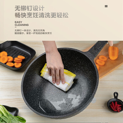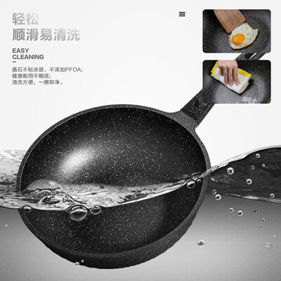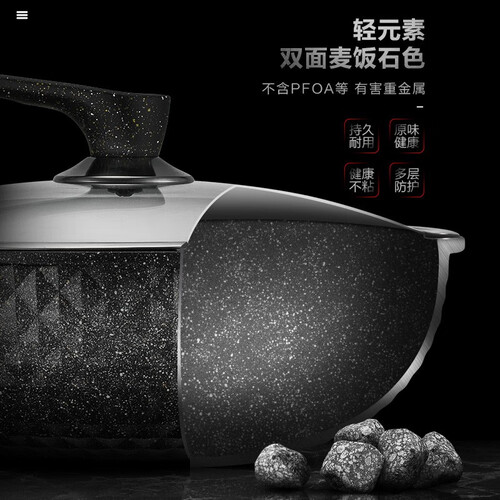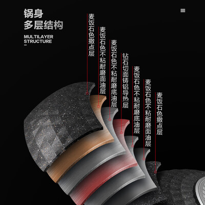锅身双面麦饭石色健康涂层持久不粘,还原美食原有风味;多层锅体结构,轻奢钻石切面外观,轻量化的体积,单手掂锅不费劲。