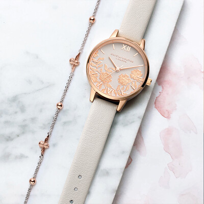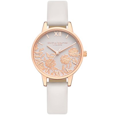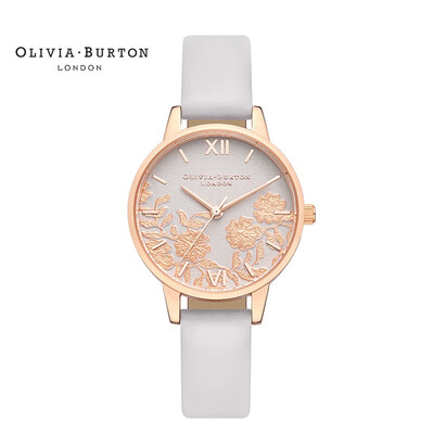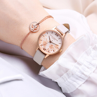 罗马浮雕刻度经典复古,定格你的优雅瞬间。表盘内立体蕾丝花叶交错,唯美浪漫,牛皮表带呈现自然纹理,散发柔美气息。