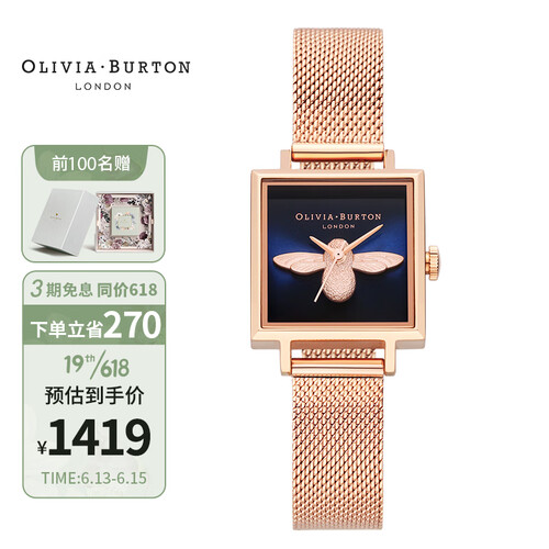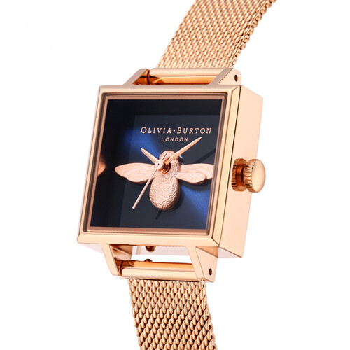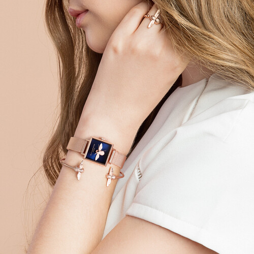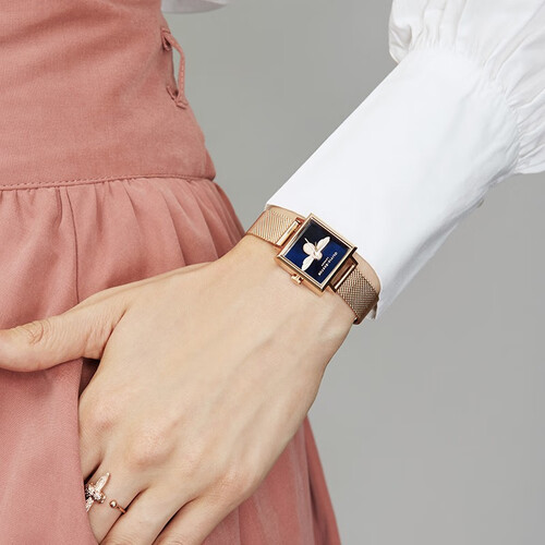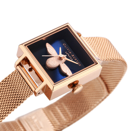 别致方形表壳,将女性的优雅与干练恰到好处的结合在一起,看起来带有些许文艺。而复古的金蜂浮雕设计,给人清新脱俗的既视感。