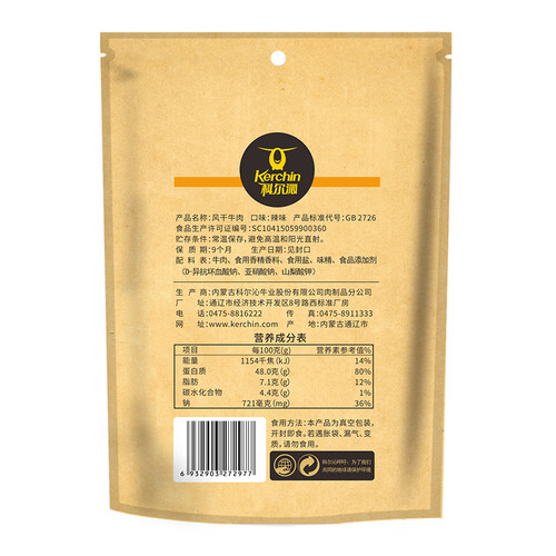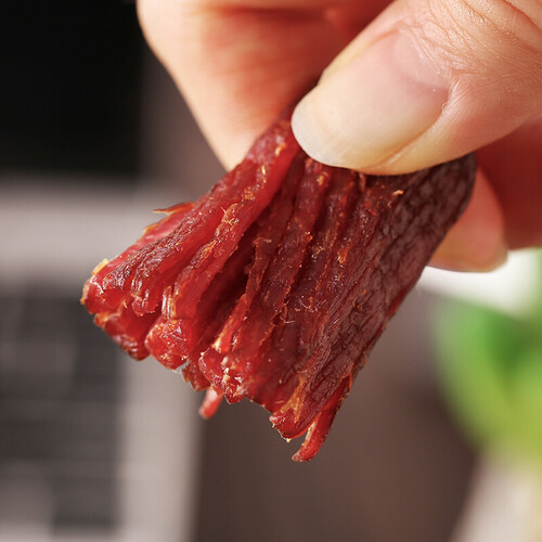 采用大草原地区放养黄牛后腿肉,传统手工工艺,肉条紧实,口感劲道。秘制配方腌渍入味,长时间风干处理,红亮入味,越吃越好吃。
