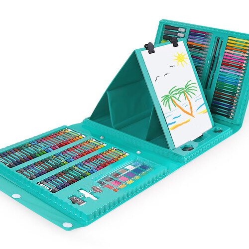 二十四色铅笔,不易折断易上色,蜡笔笔头圆滑,耐磨好涂抹,水彩笔粗细杆均具备,出水顺畅,使用方便,画饼易溶,色彩饱满。