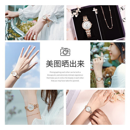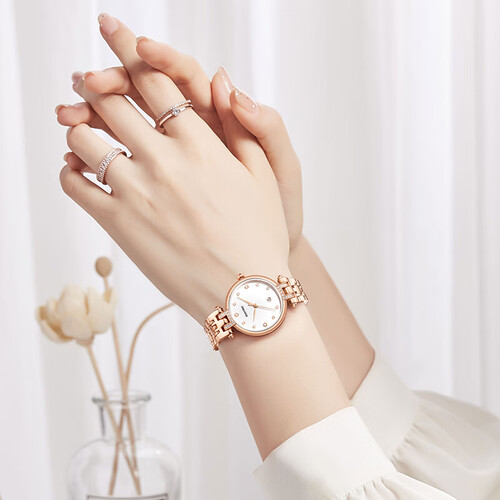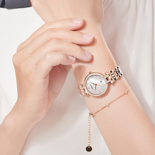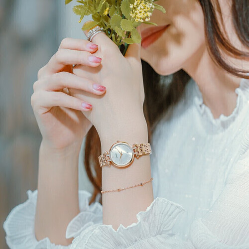 316L精钢材质制作的表壳耐磨结实,具有出众的质感。轻薄的设计贴合手腕,显得轻盈迷人。锆石字钉,显得璀璨夺目。