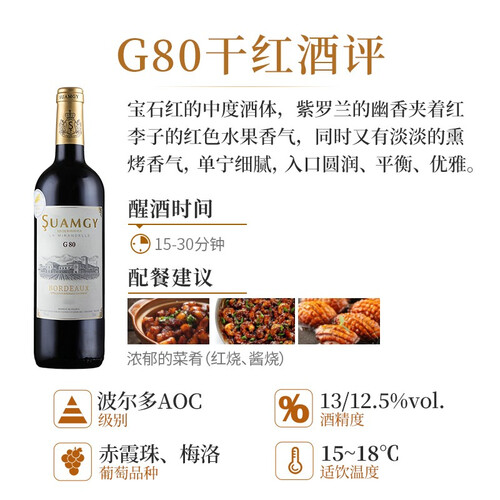 选用波尔多地区的葡萄酿造,深红色的酒体散发着新鲜水果的芬芳,混合着淡淡的熏烤香气,口感多样而复杂。