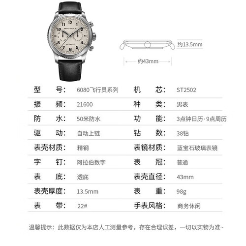 这款手表采用的机芯性能好,长时间储能,告别频繁上弦的烦恼。大小盘的组合设计,丰富时间信息,避免忘记时间。