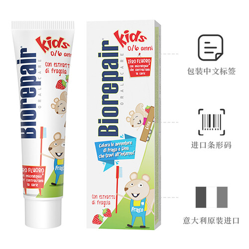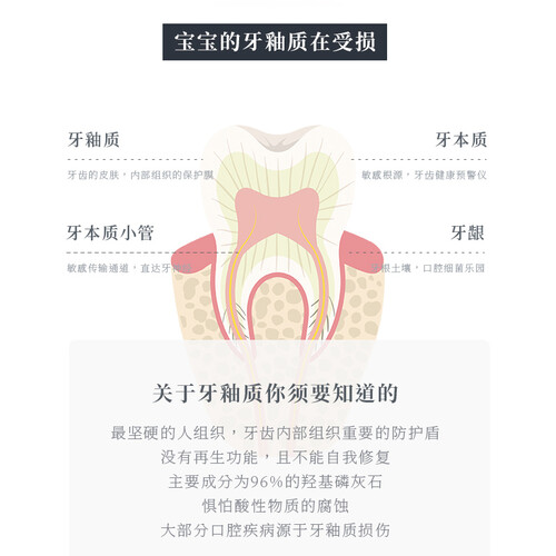 专利成分改性羟基磷灰石,可帮助修护宝宝受损牙釉质,还原牙齿光滑表面,不受蛀牙侵扰。不含发泡剂,口感香甜,宝宝刷牙不抵触。