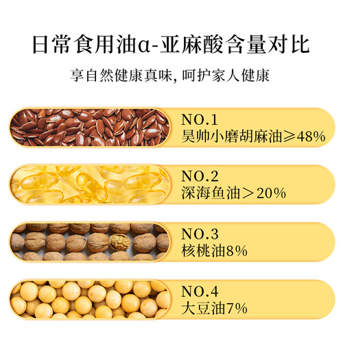 采用原始的小磨工艺加工出的亚麻籽油,口感醇香,不腥不腻,而且富含亚麻酸,搭配深沉的色泽,尽显优质食材的上乘品质。