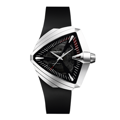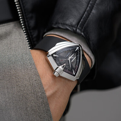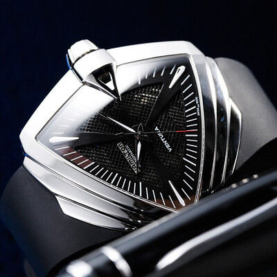 手表的表盘采用非常个性的三角形设计,颇有未来感的一款男士机械腕表。镂空表盘设计,可以清晰看到机芯内部转动。