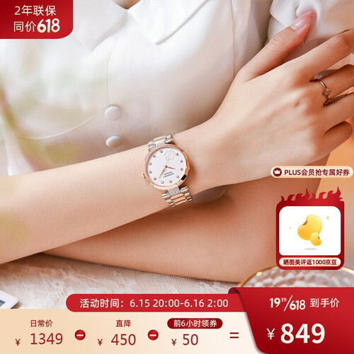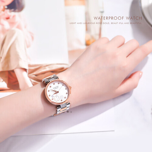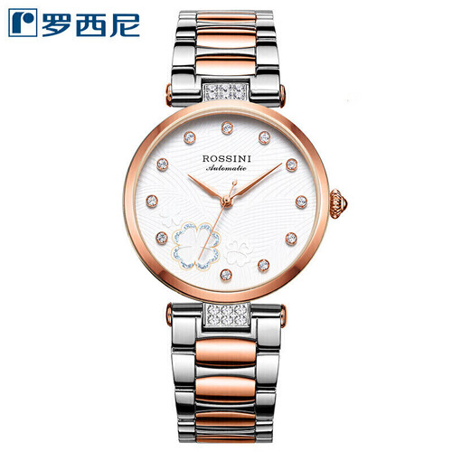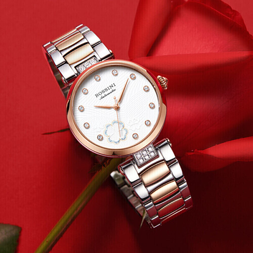 表带采用了双按式蝴蝶扣,摘取佩戴很便捷,不易掉落,表冠的造型如同南瓜马车,非常唯美梦幻,盘面镶钻。
