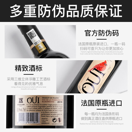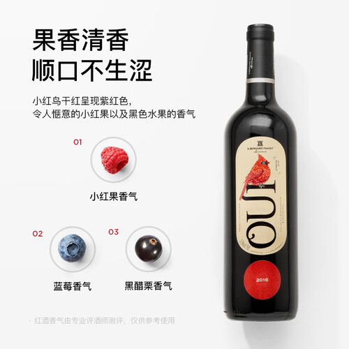 从采摘、发酵到窖藏、装瓶等全过程,均在法国原产地完成,原瓶进口保证品质。酸度、单宁略低,口感小清新,更适合国人饮用。