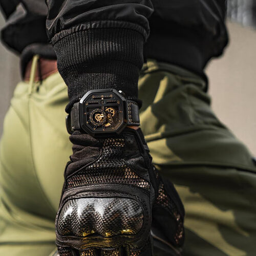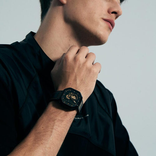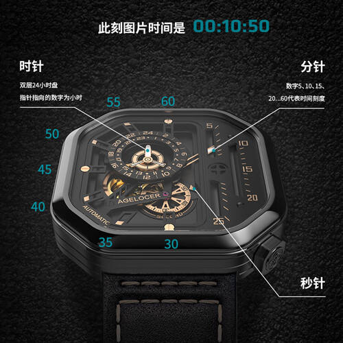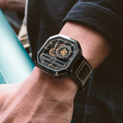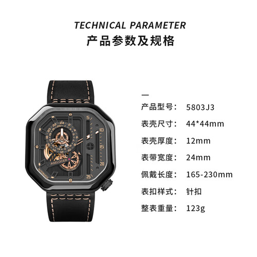全自动的机械手表,采用28颗红宝石轴承与透视的机芯,十分的帅气。盘根交错的镂空结构与人工蓝宝石镜面,整块表很是档次。