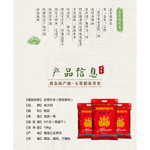 老大同东北大米精挑细选黑土地大米,米粒温润如玉,米香淡雅,米色晶莹剔透,蒸熟光泽油亮,入口绵软悠长,香软可口。