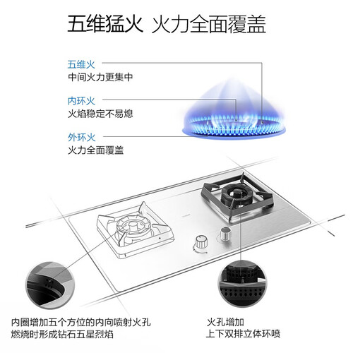燃气灶的内圈增加五个方位的内向喷射火孔,使燃烧时受热更加均匀,贴心的细节设计,有效防止漏气,避免孩子误操作。