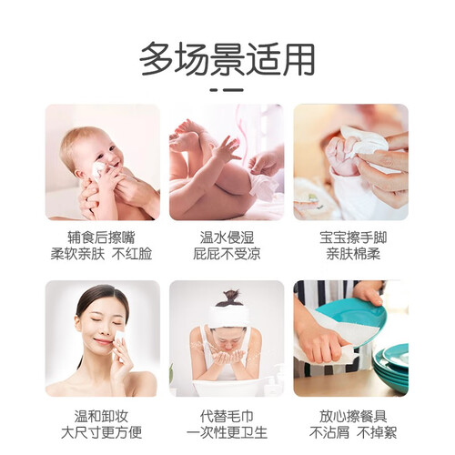 纤维网面结构,锁湿更锁水,干湿两用更方便;优质美棉,适合宝宝柔嫩肌肤,孕产妈咪一样适用,温和卸除淡妆。