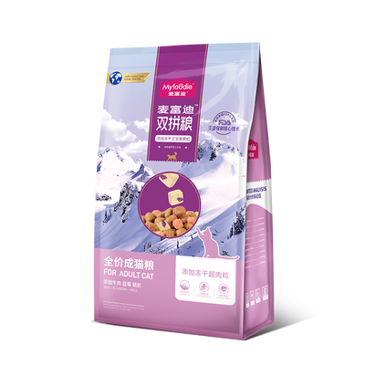 采用冻干技术制作双拼猫粮,添加肉粒及三文鱼粒,口感丰富有营养,满足挑嘴猫咪。添加蔓越莓,富含维生素C和花青素成分,提供丰富营养。
