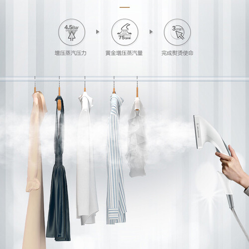 这款挂烫机外形符合美学设计,整体华美大气。仿鲨手柄,握感舒适,贴心照顾到衣物死角。自动加水提醒,拒绝干烧。
