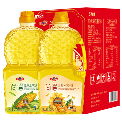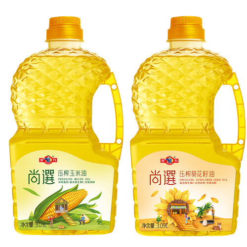压榨葵花籽油富含亚油酸、亚麻酸和维生素E,压榨玉米油充氮保鲜。早餐适用清淡的葵花籽油,食用植物油做丰盛的晚餐。