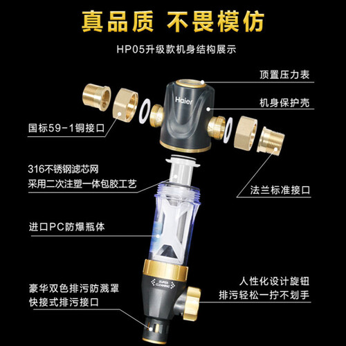 支持虹吸式冲洗方式,快速去除滤芯上的杂质,避免堵塞水道。顶部带有压力表,方便随时查看管道压力,做到心中有数。