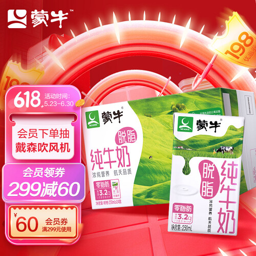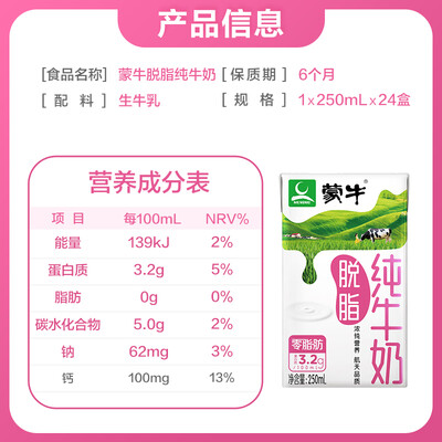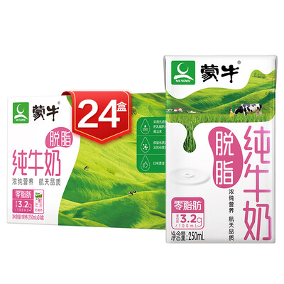 蒙牛纯牛奶可以补充体力,唤醒活力,脱脂又营养,助力练就好身材。先进分离乳脂肪工艺,健身人群也可放心饮用。