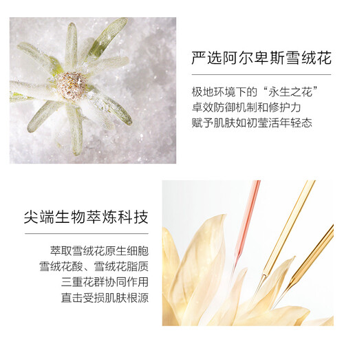 添加三重雪绒花精粹,提升肌肤防御机制与修复力。运用尖端生物萃炼科技,直达受损肌肤根源,有效丰润滋养,饱满弹润,平滑肤质。