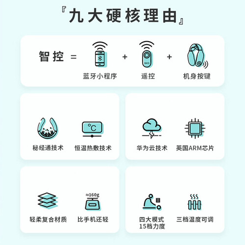 采用自动关机功能,3无人操作后可自动关机,让使用更安全。搭载360度浮动电极片,自动适应颈部曲线,让按摩效果更出色。