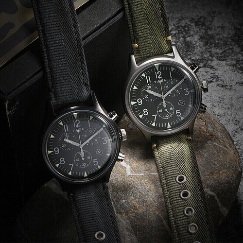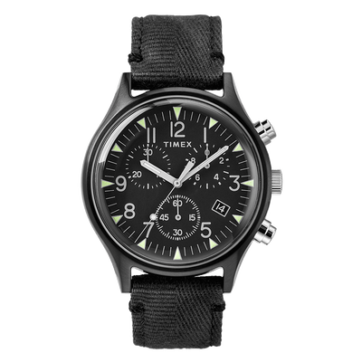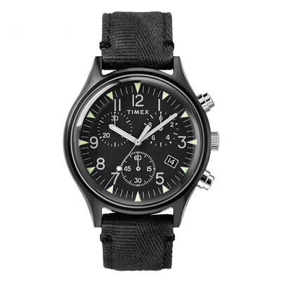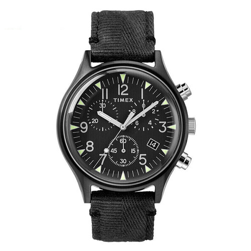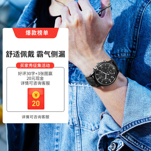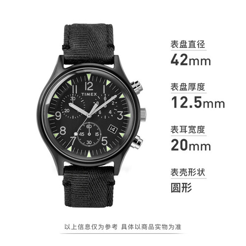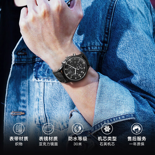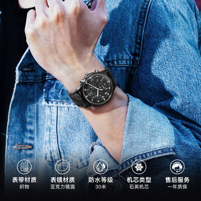 全表盘夜光,夜间查看时间与计时都很方便。搭配黑色的织物表带,佩戴时更透气非常细腻。