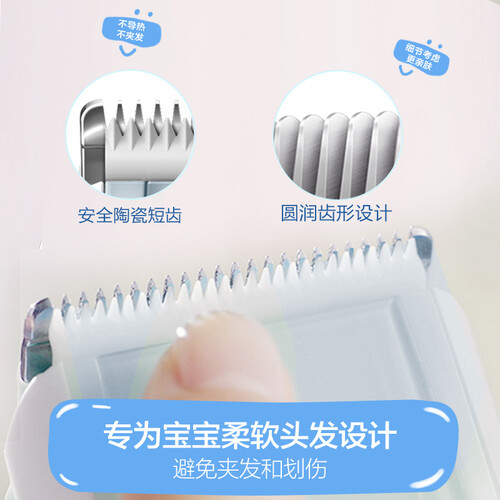陶瓷短齿刀头,接触头皮如按摩般舒适,安全理发不卡发。创意帽兜碎发收集器,十分贴心,让小宝宝摆脱碎发掉落身上引起的不适感。
