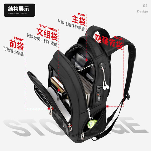 采用多隔层设计,合理收纳,小型背包也能放下超多物品,设有三位数字密码锁,超多数字组合,全方位安全防盗。