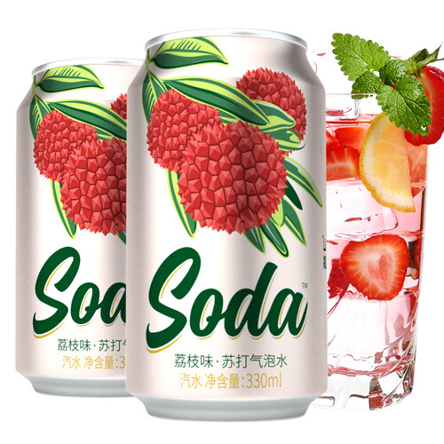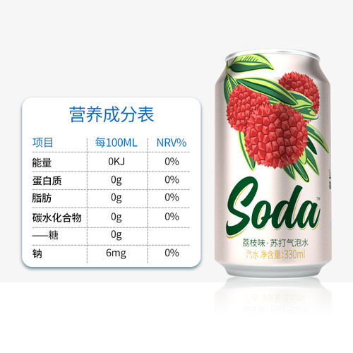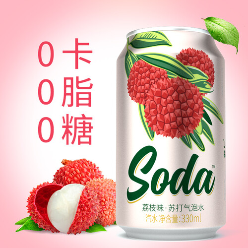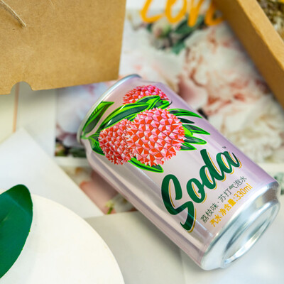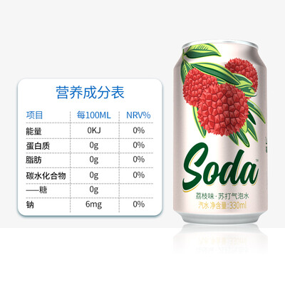 无糖设计更有利于人体健康,气泡水搭配新鲜荔枝,经典时尚;白色金属易拉罐外壳搭配红色荔枝和绿色枝叶,颜值满分。