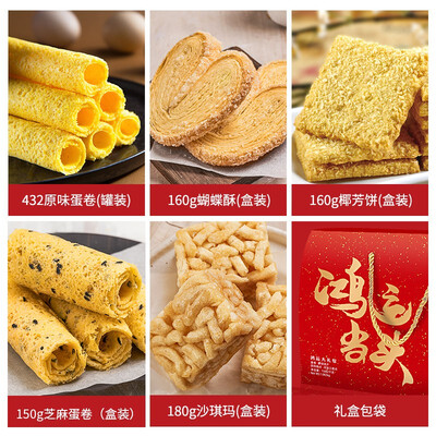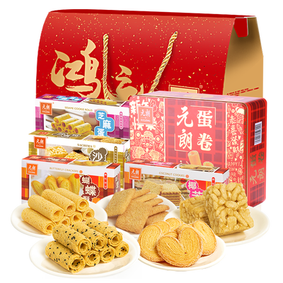 元朗年货零食大礼包包含酥脆蝴蝶酥,香浓奶香,层层酥脆,酥香果仁条口感丰富,清甜椰芳饼酥脆爽口,浓浓椰香,好吃到停不下来。