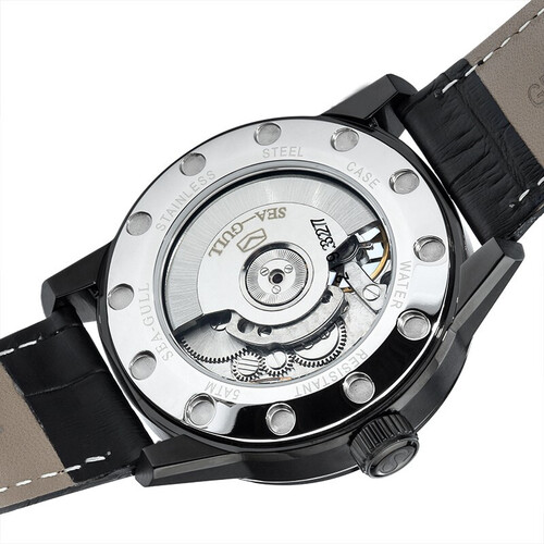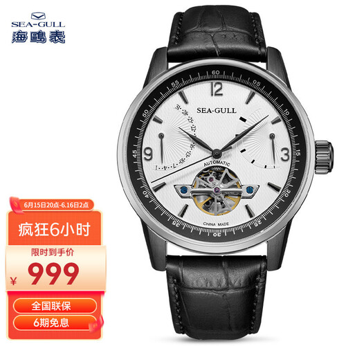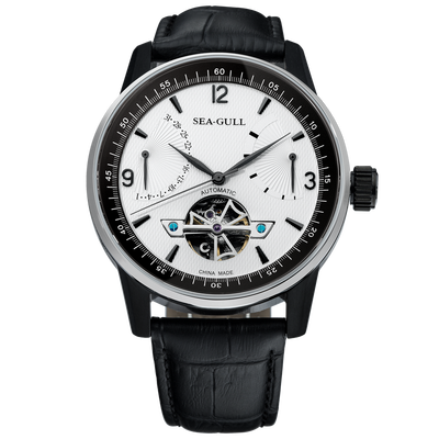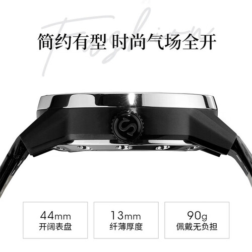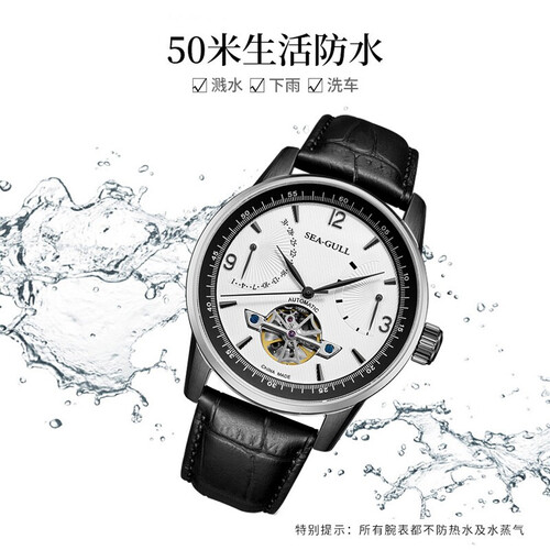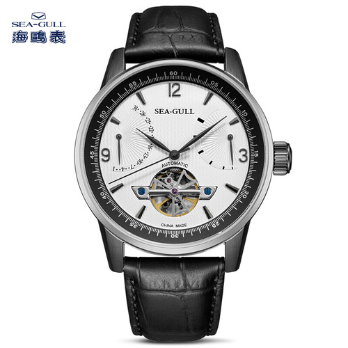 手表盘面上搭载了飞轮设计,具有机械的动感,白盘搭配黑色刻度指针,层次突出,同时表带用牛皮制成,细腻柔软。