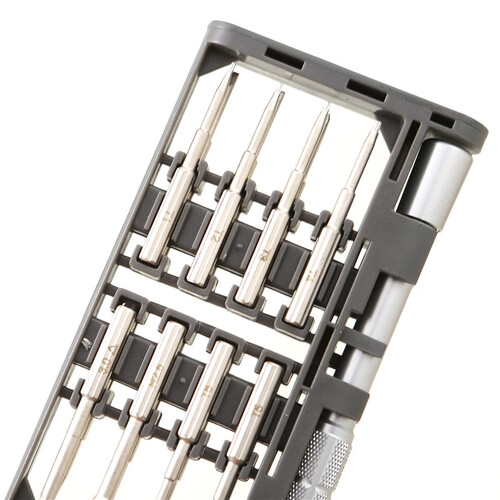 配备便携收纳盒,轻巧且不易丢失;钻石纹防滑手柄设计,使用更加精准灵活;有着16支批头,轻松应对大小维修。