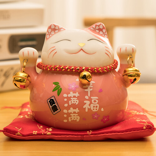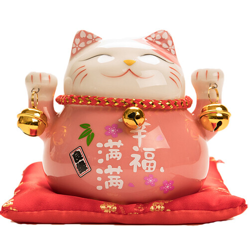 笑脸相迎的粉色招财猫,双手平提质感小铃铛装饰,释放出喜悦的气息。底部设有红色印花布垫,颜色明艳花型精致明朗,更显喜庆。