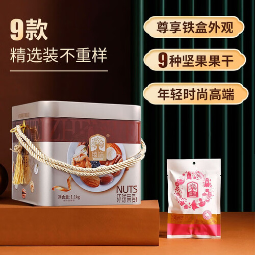 采用创意雅致的礼盒包装,是一款高端送礼的佳品,非常贵气有面。内含12种严选果干坚果,补充多重养分。