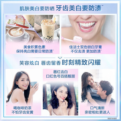 拥有1亿抛光粒子,能赶走齿面牙渍,且有锁白成分附着齿面形成保护伞,无惧外来染色,让牙齿持久亮白,精英职场交流无障碍。