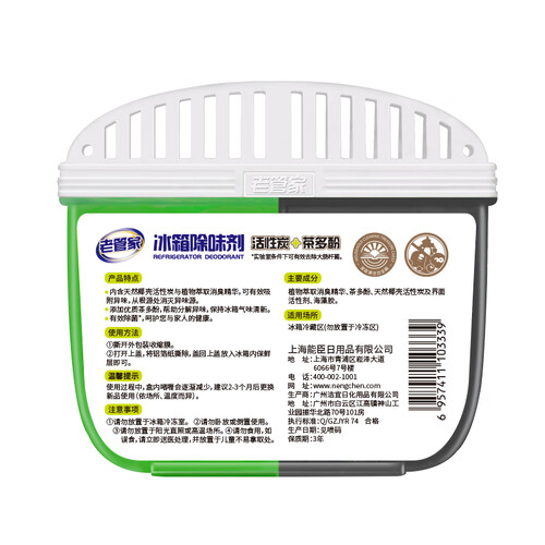 使用自然椰壳活性炭制成,可以彻底去除异味。含有绿茶萃取茶多酚,可快速分散异味,冰箱可以时时保持清新。