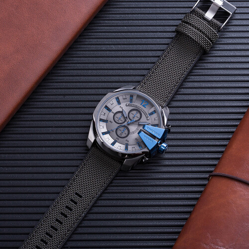 三眼计时设计,搭配不锈钢材质的表壳,整体上大方时尚。尼龙材质的扣带式表带,突破界限,追求与众不同的时尚定义。
